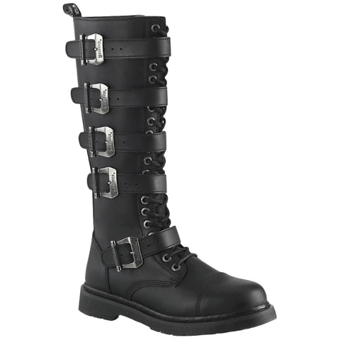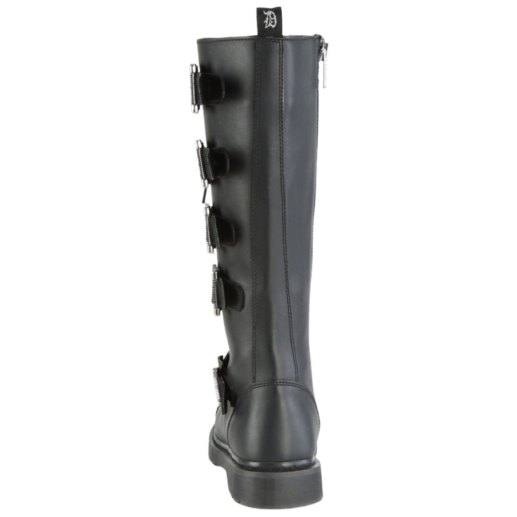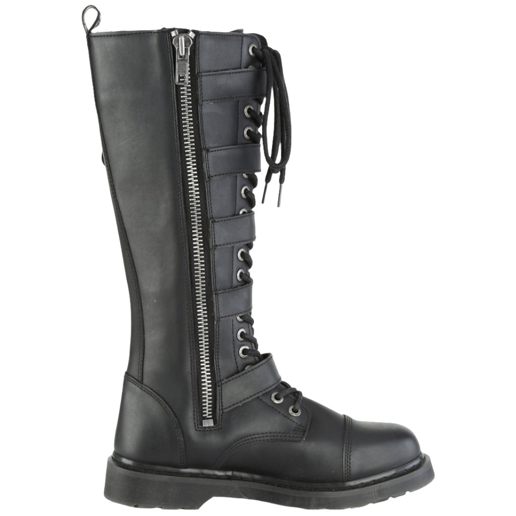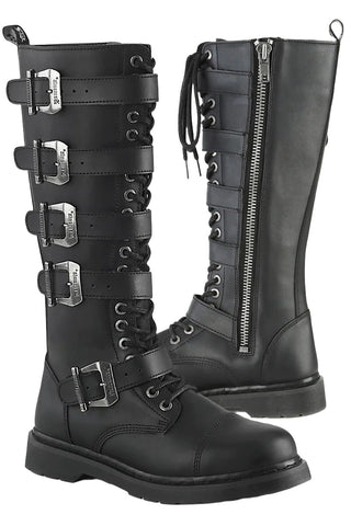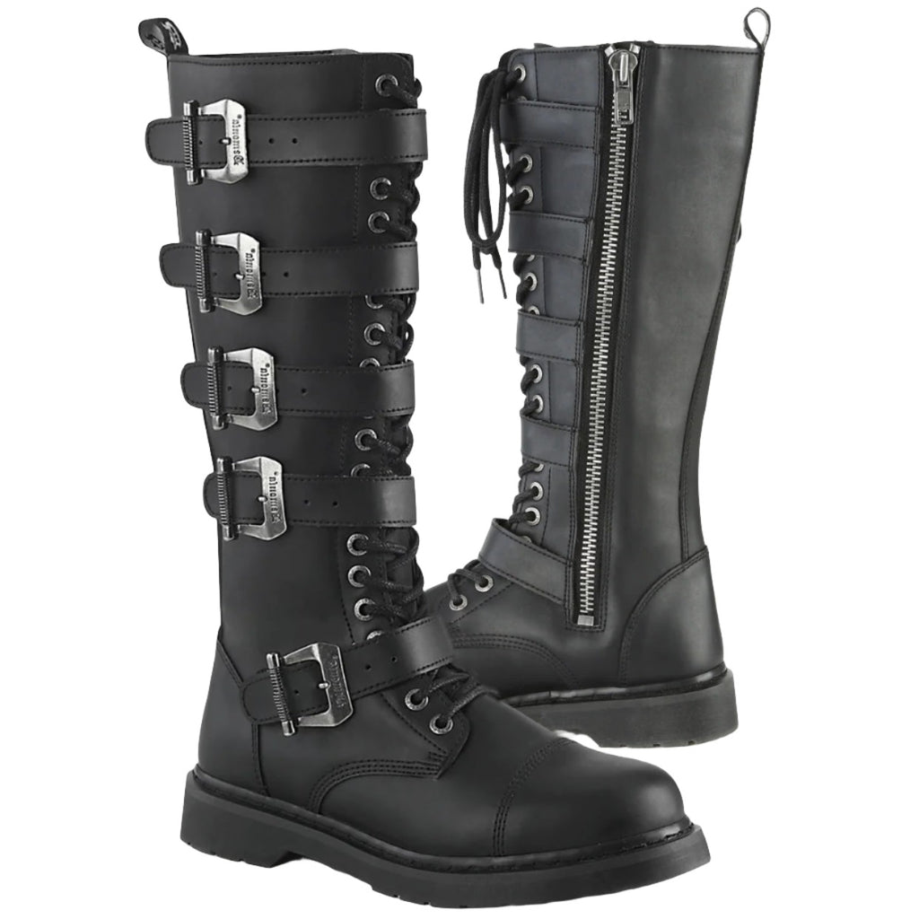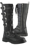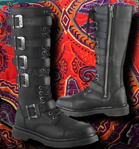 1 1/4" (32mm) Heel 20 Eyelet Unisex Knee High Combat Boot Featuring 5 Buckle Straps, Inside Zip Closure.