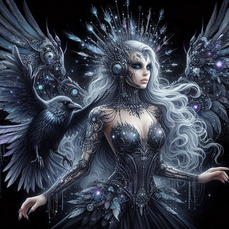 To her side, a poised raven adds to the air of dark fantasy and mystique. This print is a unique blend of nature, royalty, and technology, perfect for anyone who appreciates the beautiful collision of sci-fi and fantasy.