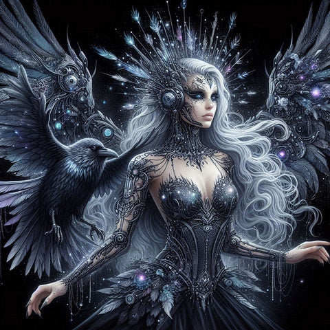 She wears a striking, spiked headdress that is a masterful blend of organic elements like feathers and crystals with advanced, mechanical components that glow with a soft light. The corset of her dress shimmers like stardust, and her sleeves are an extension of the beautiful patterns on her arms. Dominating the piece are her magnificent wings—a complex fusion of dark, detailed feathers and mechanical structures, illuminated by a brilliant blue and purple glow.