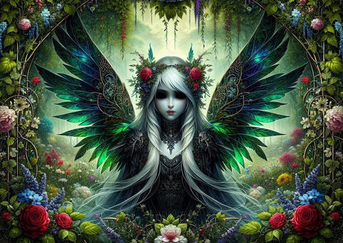 Her intricate, dark clothing appears to be made of delicate lace and dark feathers, perfectly complementing her magnificent wings. These large wings are a focal point, with an iridescent design of feathers that shimmer with a variety of greens and blues, creating a sense of wonder. The figure is shown rising from an overgrown garden, surrounded by an abundance of wildflowers and roses. The background is a soft, dreamlike blur, giving the entire scene a magical and tranquil feel.