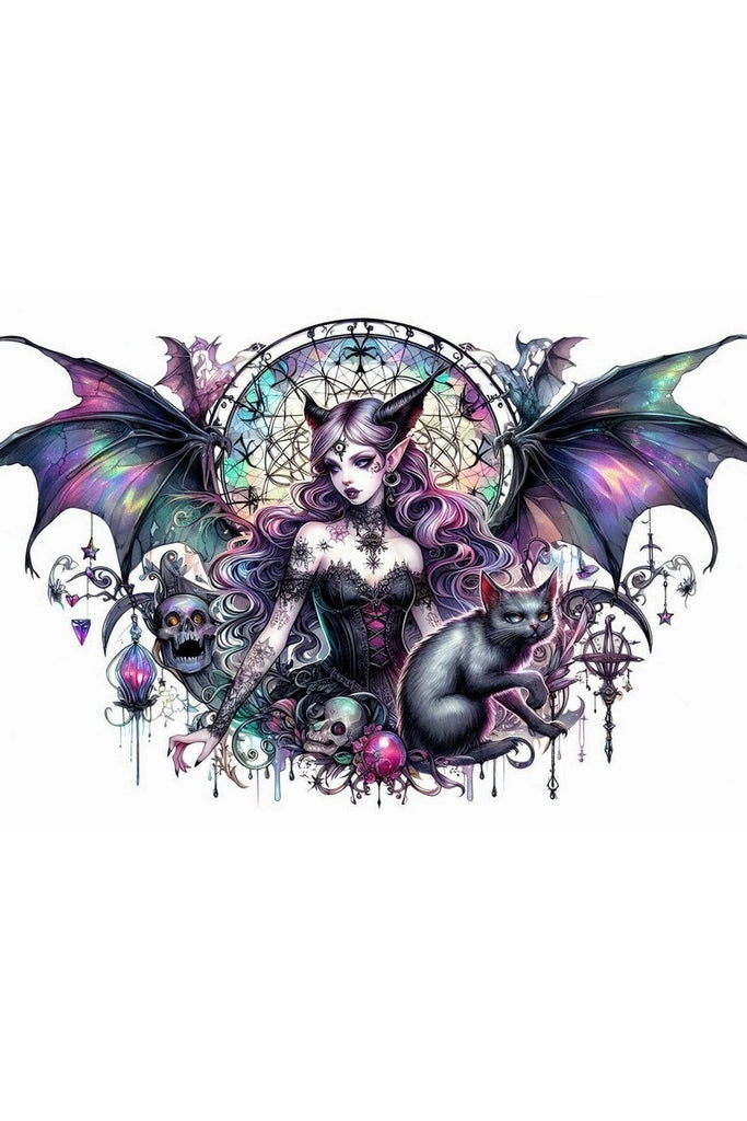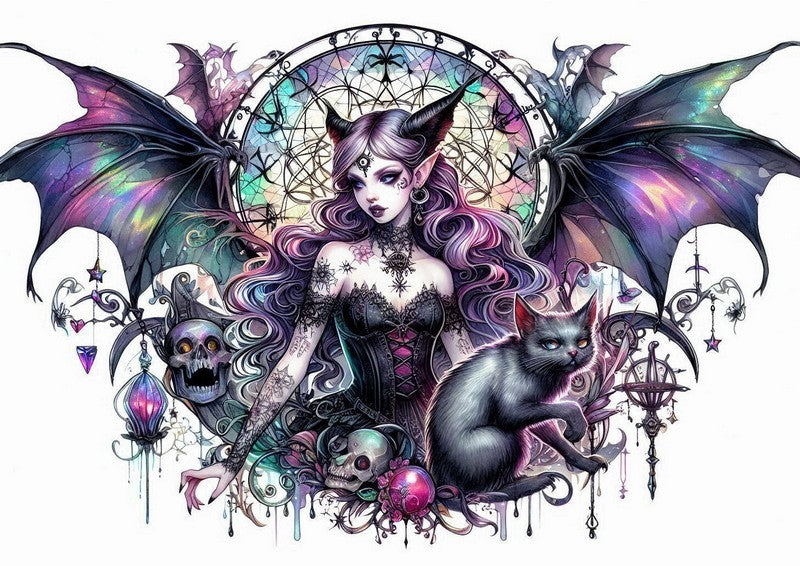 Every detail in this artwork tells a story. From behind her, two large, iridescent bat wings shimmer with shades of purple and green, creating a magnificent frame for the central figure. A soft, circular stained-glass window with pastel panes glows behind her head, adding an ethereal touch to the dark theme. The composition is rich with symbolic gothic elements: an ornate lantern with dangling crystals, mysterious skulls, and a large black cat with piercing blue eyes. Below, a vibrant pink crystal adds a pop of light and magic to the scene.