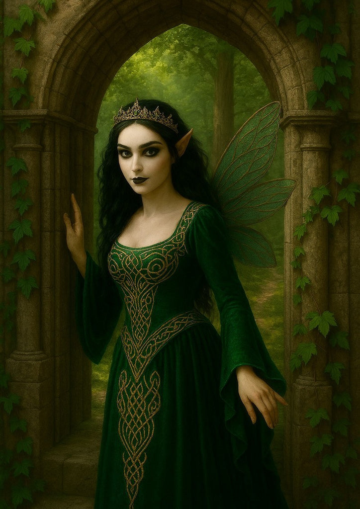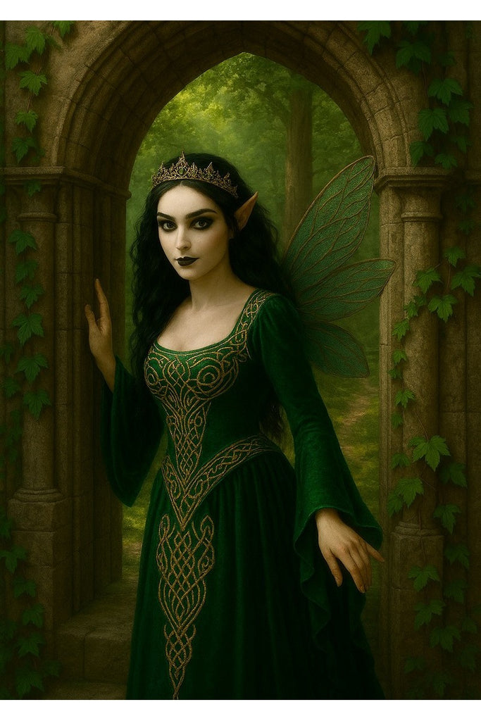 Step into a world of myth and magic with the Emerald Queen Print from Oakhart Industries. This captivating portrait brings to life a powerful, ethereal fairy queen, poised within a mossy stone archway. Her presence is commanding, with long dark hair, pointed elven ears, and shimmering, translucent green wings like those of a dragonfly. She wears a striking dark crown and a flowing emerald dress adorned with intricate gold Celtic knotwork, symbolizing her connection to ancient lore. Her intense gaze and dark makeup give her an air of deep mystery and strength. The backdrop of a lush forest, bathed in dappled sunlight, creates a mystical atmosphere, inviting you to lose yourself in her enchanted realm. This print is a testament to fantasy, power, and the untamed beauty of nature.