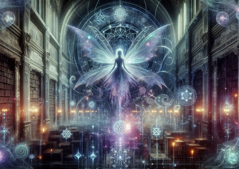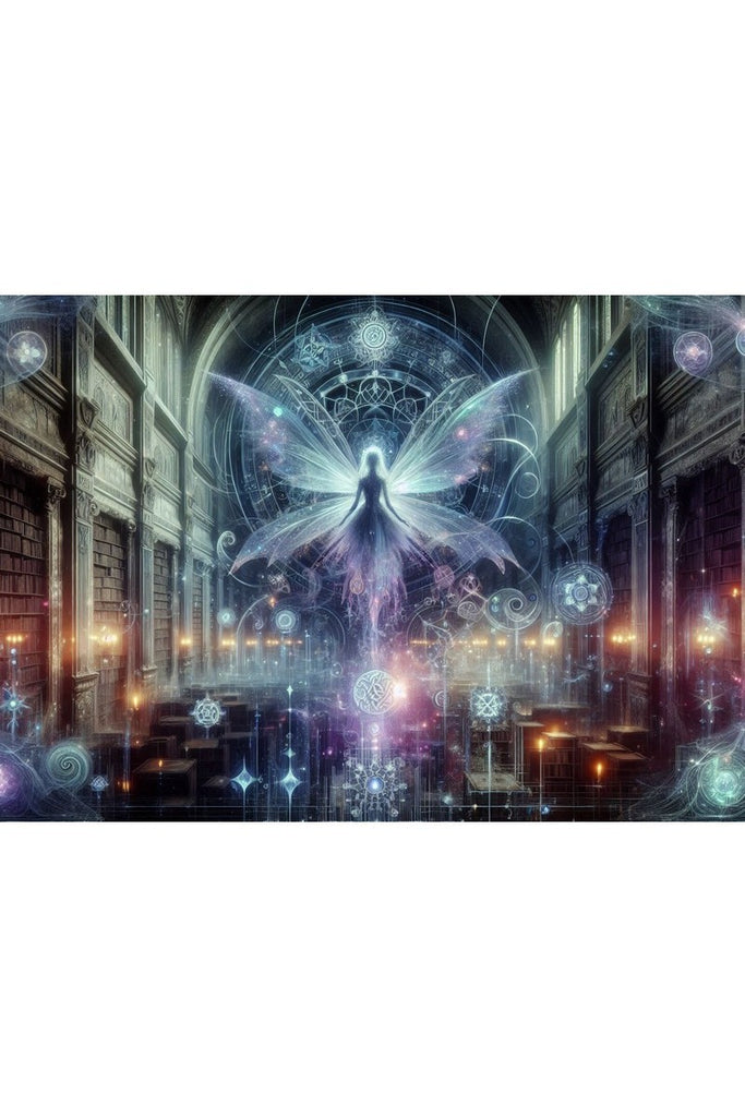 Discover the enchanting "Soul of the Library" print from Oakhart Industries. This captivating piece of art features a luminous, ethereal figure with large, glowing wings, standing in the heart of an ancient, grand library. The air around the figure shimmers with intricate celestial symbols and geometric patterns, hinting at a powerful, magical presence. Soft, otherworldly lighting in shades of purple, blue, and white bathes the scene, creating a stunning contrast with the warm, inviting glow of the candelabras.