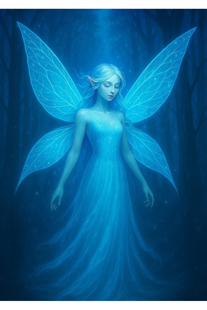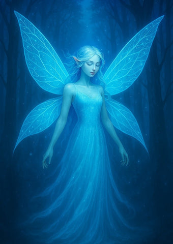 Enter a world of enchantment with The Spirit of the Glade Print from Oakhart Industries. This fantasy-themed art piece captures a serene, glowing fairy in a dark, moonlit forest. With long, pale hair and pointed ears, she is a figure of pure magic. She wears a simple light blue gown, her large, iridescent blue wings seemingly crafted from light itself. Her eyes are closed in a moment of tranquil contemplation. The dense forest background, filled with countless glowing specks of light, enhances the magical and peaceful atmosphere, inviting you to share in her quiet, luminous presence.