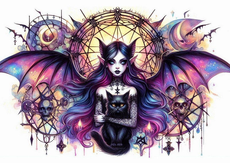 Step into a world of enchanting darkness with the Vampire Faerie Print. This vibrant and striking piece features a mythical figure with the pointed ears and large, bat-like wings of a creature of the night. Her long hair is a beautiful gradient of dark purple, blue, and pink, perfectly matching the colors of her wings. Her large, luminous eyes hold a haunting quality, while in her arms, she cradles a fluffy black cat with glowing orange eyes.