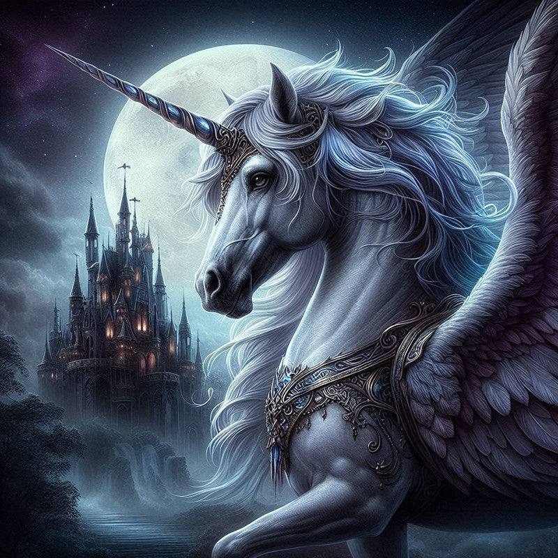 Embrace the magic of the night with this striking fantasy print from Oakhart Industries. This captivating piece showcases a majestic winged unicorn, blending the grace of a Pegasus with the mystical allure of a unicorn. The creature, with its glowing horn and luminous blue gems, stands out against a backdrop of a moonlit gothic castle.