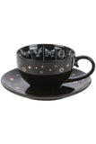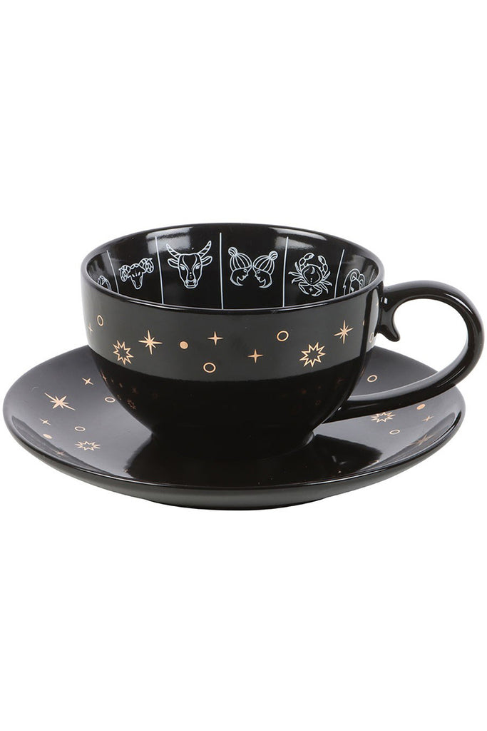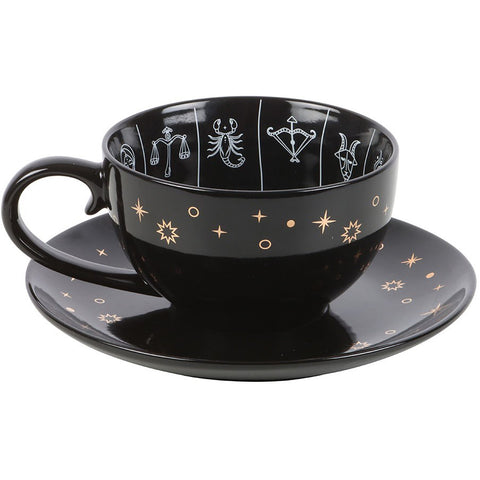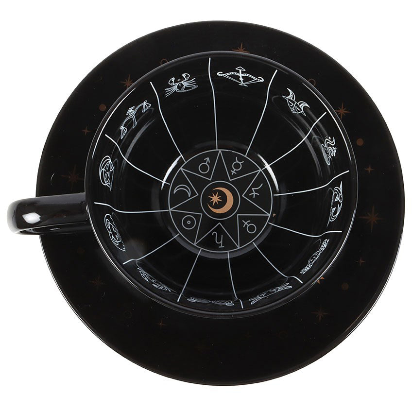 This black celestial teacup can be used for reading tea leaves which are interpreted to predict the future or gain insight into one's life. Featuring an astrology wheel design with signs of the zodiac in a premium, white and gold finish, and accompanied by a matching black saucer. The design guides the reader to make connections between the shapes of tea leaves and astrological interpretations. 500ml capacity. Handwash only and not microwave safe.