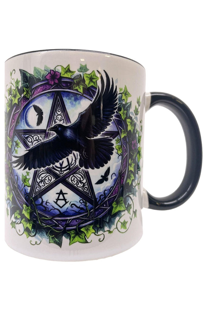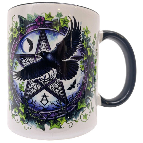 A raven flying against a backdrop of a pentagram set against the night sky.