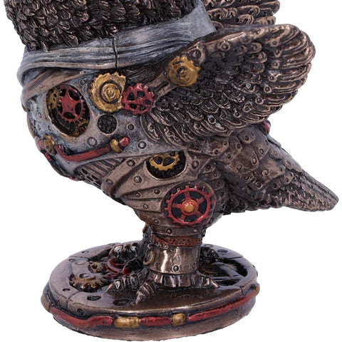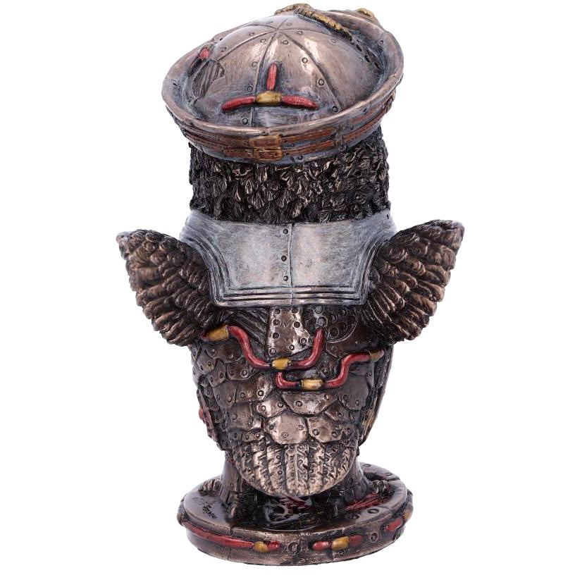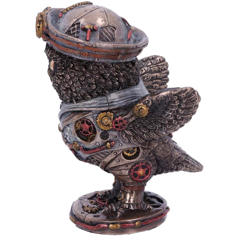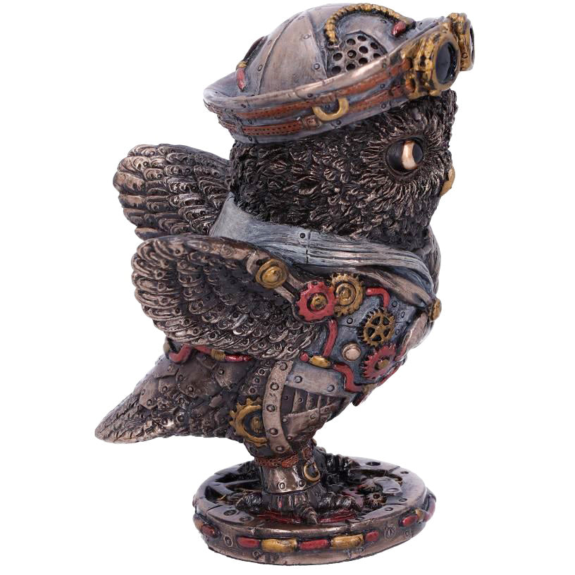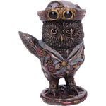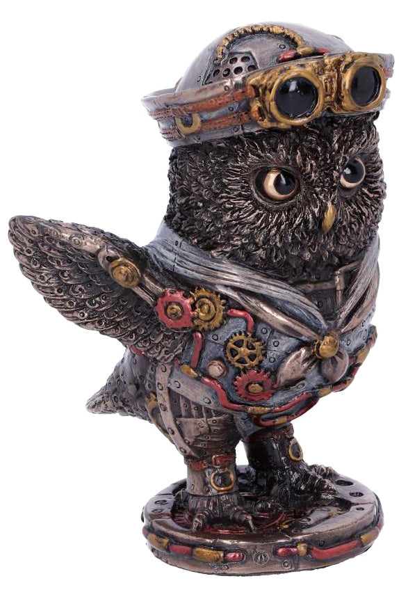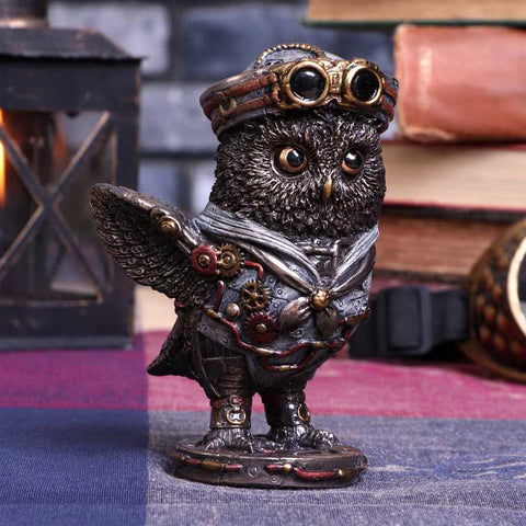 This adventurous little owl is prepared to take flight with leather aviation goggles, and mechanically enhanced wings he's planned for every eventuality. The owl's light eyes stare off to the side with razor focus, this little chap can certainly provide you with a birds-eye view. This steampunk-inspired figurine is cast in the finest resin before being painstakingly hand-painted, this item will look great on any bookshelf or mantel.