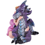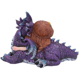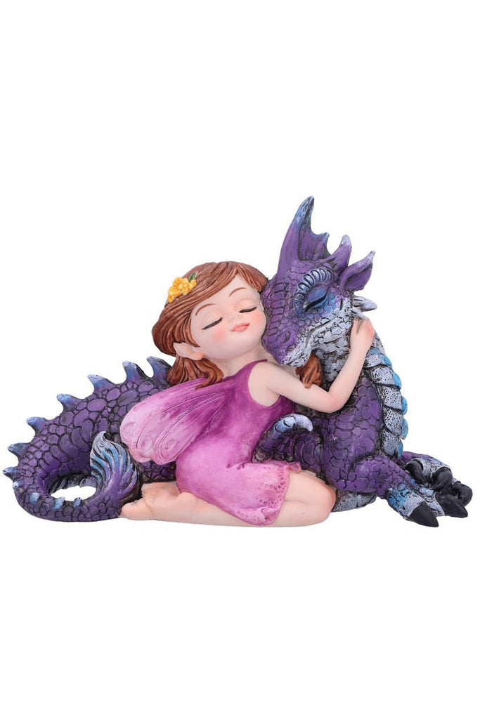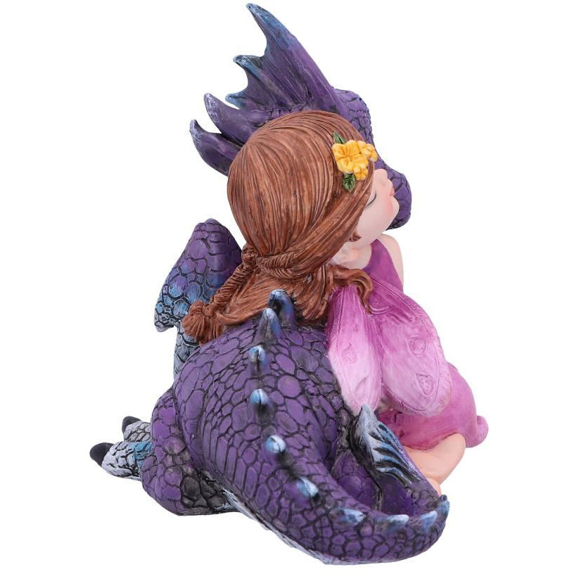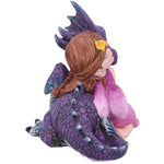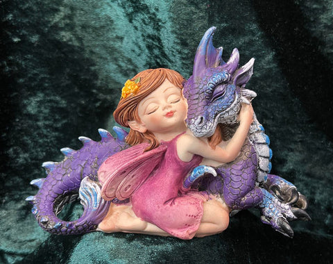 This beautiful piece would make a welcome addition to any fantasy display. A small auburn-haired fairy kneels alongside her dragon-friend A small garland of yellow flowers decorates her hair as she rests her head on the dragon's cheek. By her side is the purple coloured dragon who shows its admiration in equal measure. Cast in the finest resin before being hand-painted, this piece would make the perfect gift for anyone wanting to add a little magic into their life.