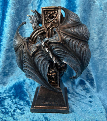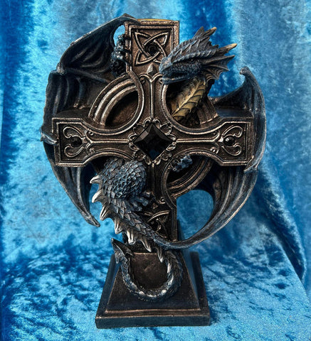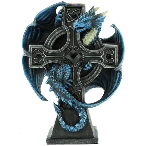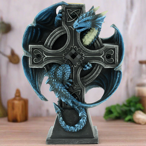 Clinging to the back of the cross with a watchful eye is a majestic blue dragon. Its powerful wings are outstretched, its head held high, as if guarding a sacred treasure. The dragon's vibrant scales and piercing gaze are reminiscent of Anne Stokes' captivating dragon artworks, sure to ignite the imagination of any fantasy enthusiast.
