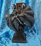 This Gothic Dragon clock comes from the Gothic imagination of globally famous alternative Fantasy artist Anne Stokes. With Celtic knot and intricate designs inlaid with black jewels, this black Celtic cross makes the perfect resting place for our fiery companion. Clinging to the back of the cross, this blue Dragon has its wings and head raised, alert to any intruders or would-be thieves. At the top of the cross there is a small space to place a candle. Cast in the finest resin before being carefully hand-painted, this piece is a fantastic way to light your way through Gothic fantasies.