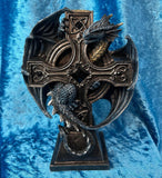 Atop the Celtic cross sits a designated space for a tealight candle. As the flame flickers to life, it casts an enchanting glow upon the dragon and the intricate details of the cross. The warm light transforms this candle holder into a mesmerizing centerpiece, perfect for creating an atmosphere of wonder and intrigue.