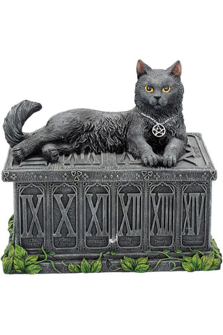 Looking like a lost stone altar deep in the forest – pitted with lichen at the top as tendrils of ivy creep around the bottom – the box has numbers circling the outside, naming the major arcana of the tarot deck in order. Counting from The Fool to The Star, the remaining arcana are on top, but obscured by a reclining cat. Black and furry, with a silver pentacle hanging from its neck, it looks up with a preternatural intelligence and curiosity. Within the box, a few autumn leaves lie scattered over an engraving of the four tarot suites – Pentacles, Rods, Swords and Cups. This piece is the perfect gift for the mystic seeker of knowledge in your life – even if that person is yourself. Store your most trusted tarot deck in safety and style.