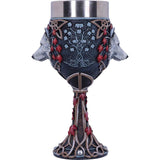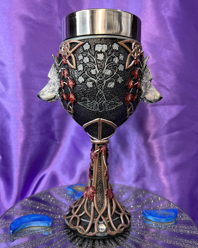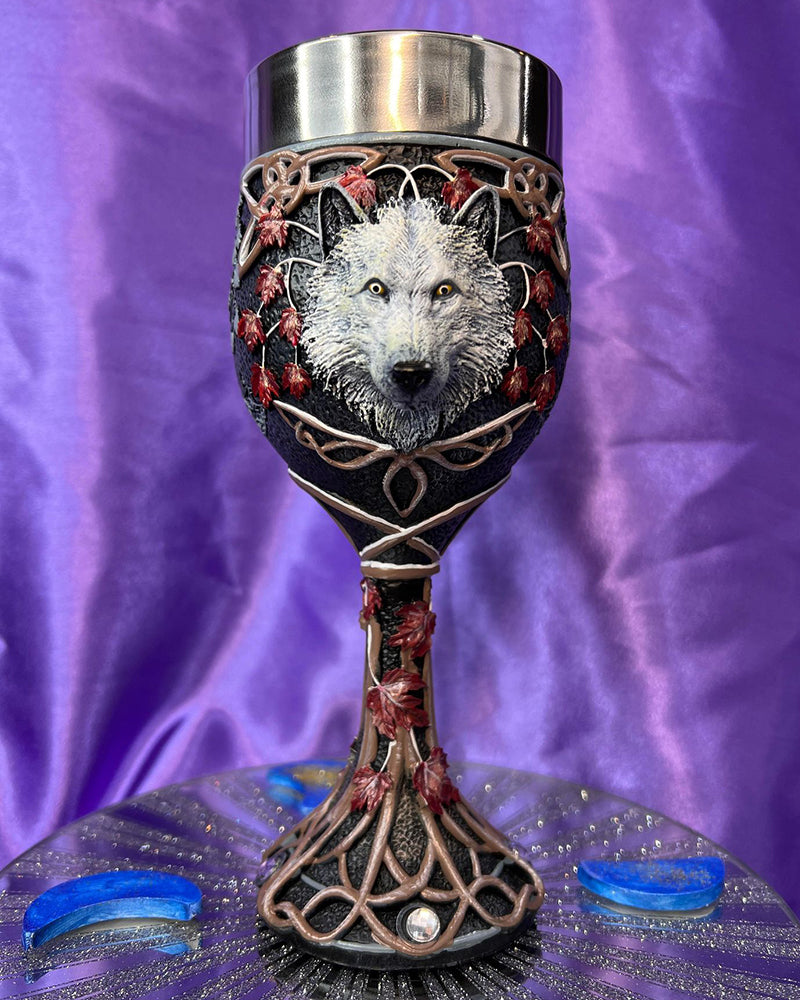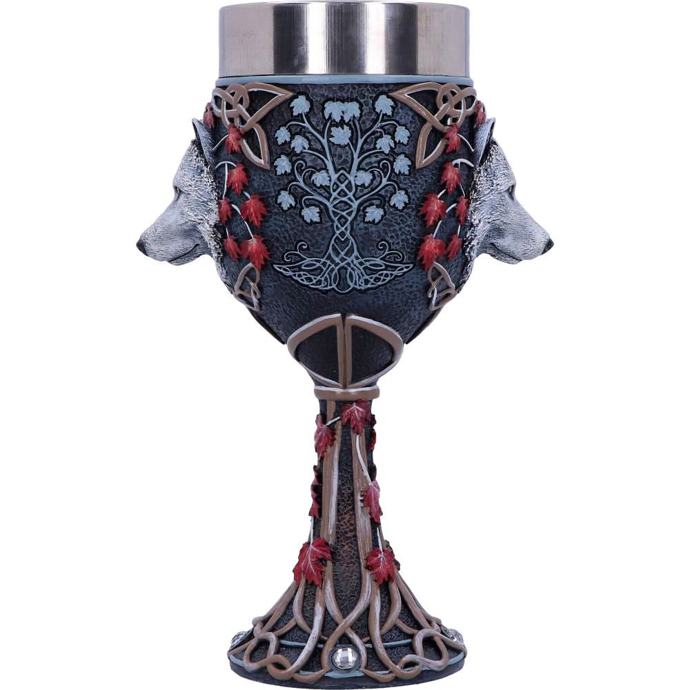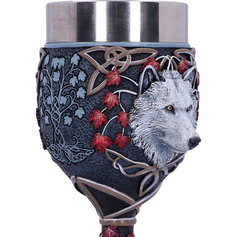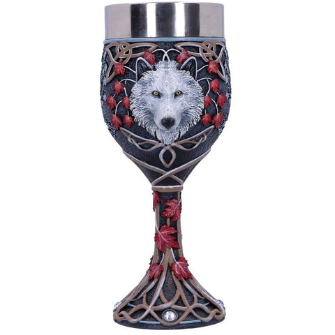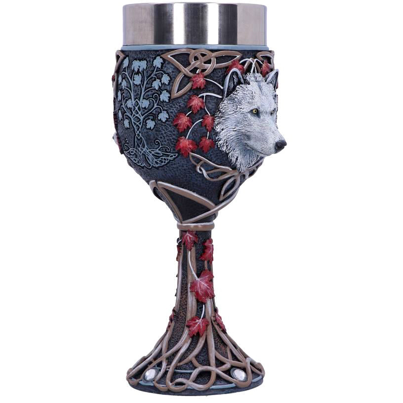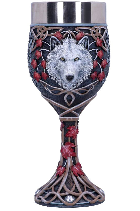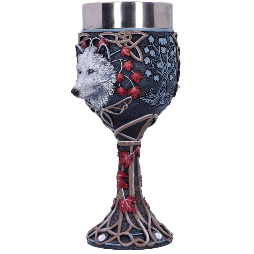 From the untameable imagination of Lisa Parker. A White Wolf’s head stares directly at you, soft yellow eyes portraying a soul untouched by civilisation. Behind this majestic beast, there sits an elaborate Celtic pattern, edged with burnt red autumn leaves. Winter will soon be upon us... The stem is decorated with the same fall leaves and features four clear gemstones. Cast in the finest resin before being painstakingly hand-painted, this Goblet is perfect for anyone who has a passion for the wild.