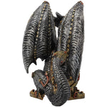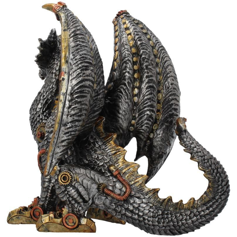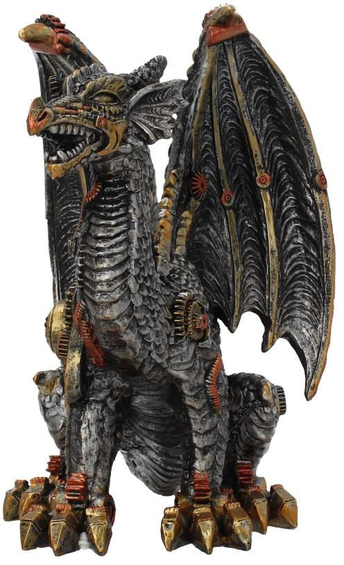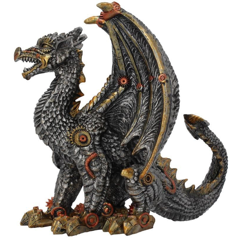 Guard your workshop with the Mechanical Protector. Standing proudly, a mechanical dragon roars, wings spread menacingly. Interlocking steel plates form the scales of the dragon, brass cogs and bronze plates reinforcing and providing mobility. Cast in high-quality resin before being expertly hand-painted, this mechanical dragon makes the perfect guardian.