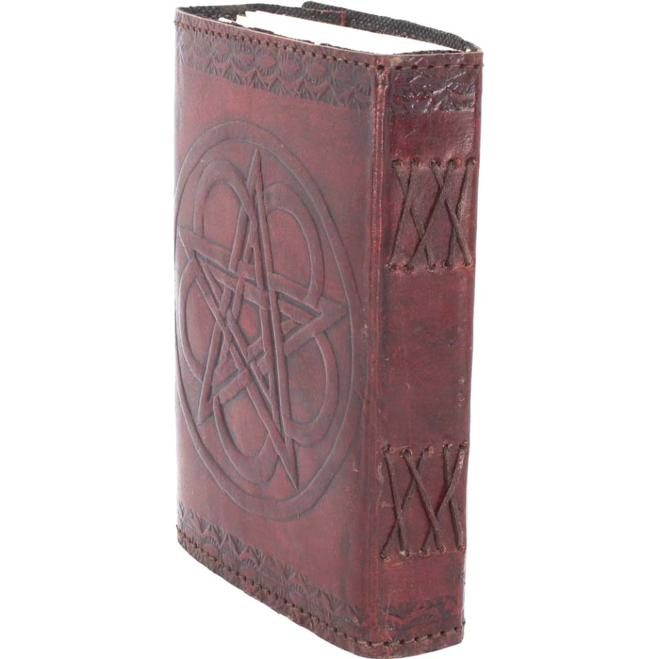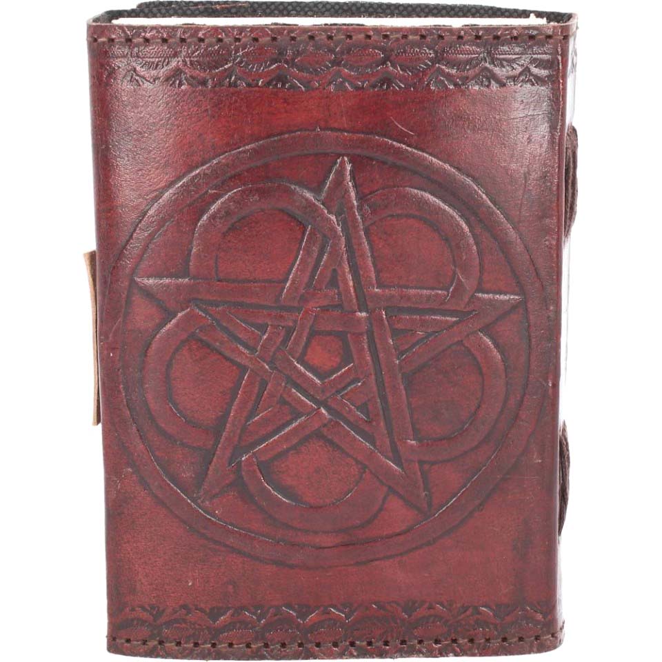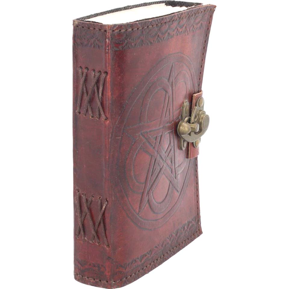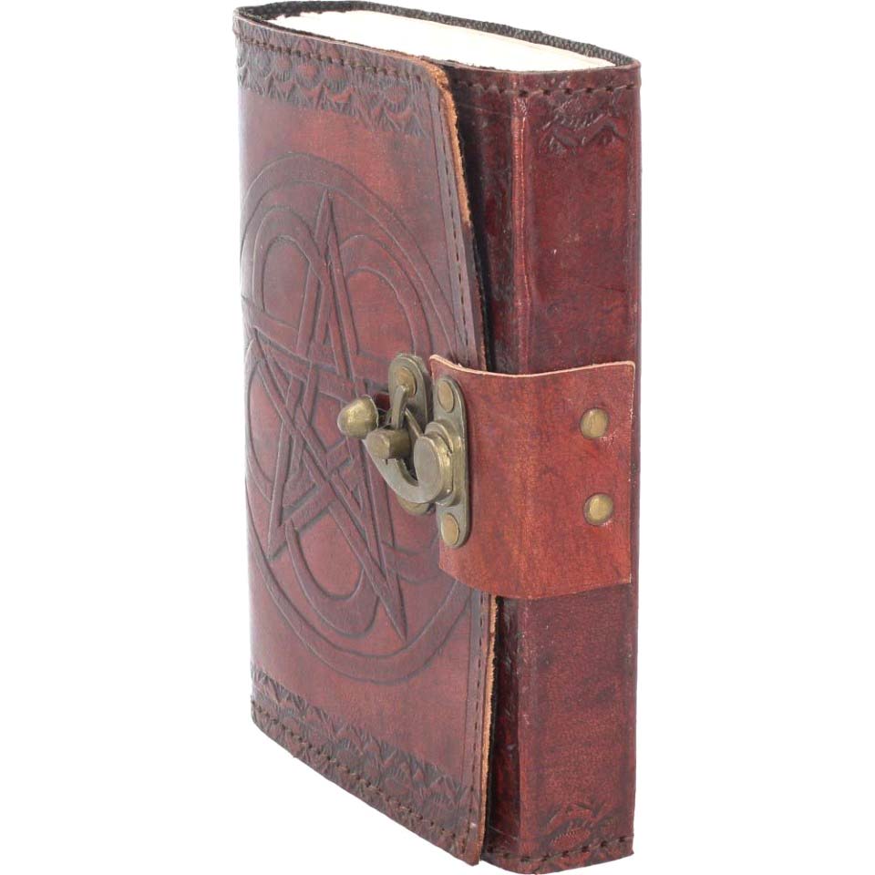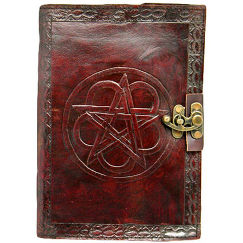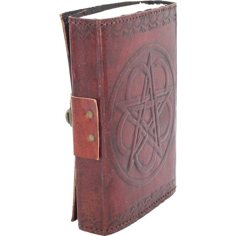Channel your love of witchcraft with this mystical Leather Journal. Bound in brown leather, the book comes with one metal clasp, keeping it from falling open unexpectedly. The cover is embossed with the image of a large ornate pentagram, bordered by an intricate floral pattern. The elaborate design transcends the bounds of religion, race, creed and geography. Inside, high-quality plain paper gives you the freedom to record your thoughts and dreams unimpeded.