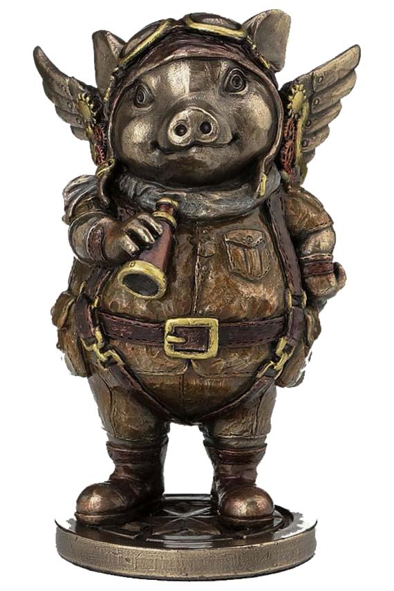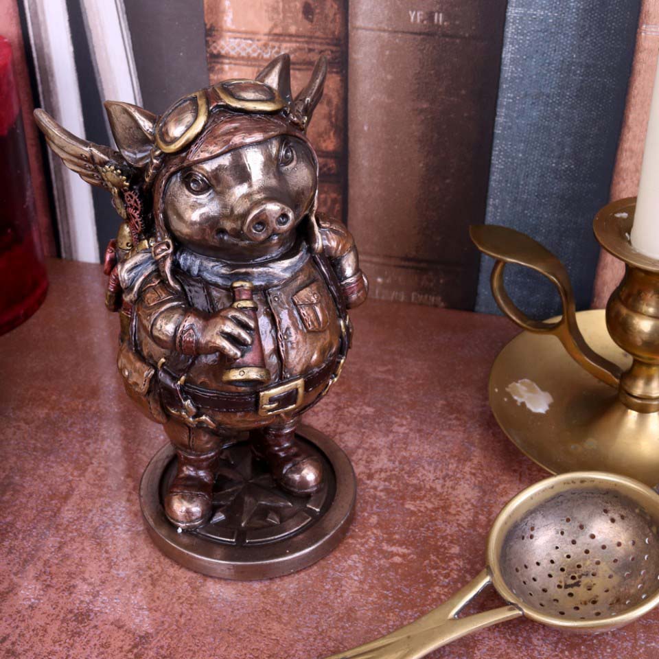 This adorable pig proves that stereotyping is wrong! Complete with aviator goggles, jumpsuit and mechanical wings, he is ready for action! Cast in the finest resin before being finished in bronze and hand-painted, he would make the perfect addition to any Steampunk collection.