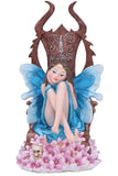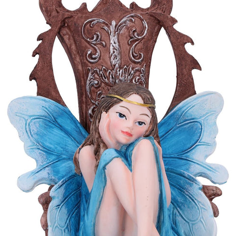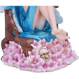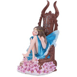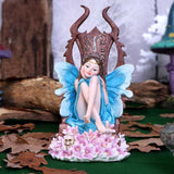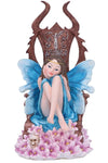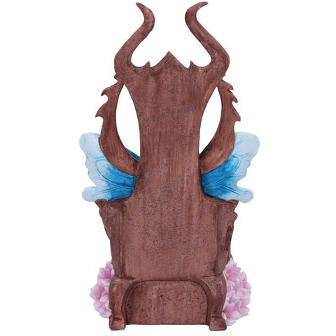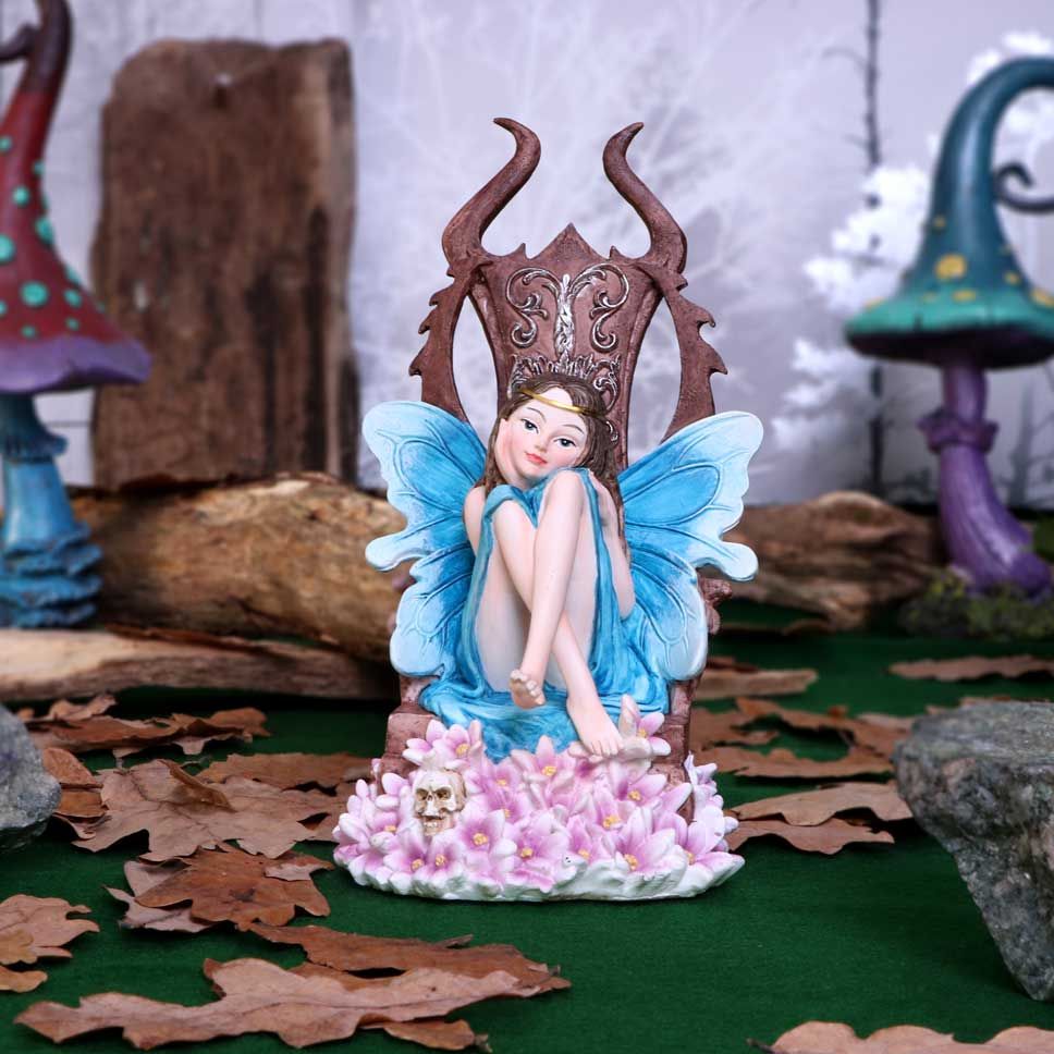 Sitting on an imposing oaken throne, ornate designs carved into the back and sides, this young woman wears a golden crown, over her long brown hair. She looks forward lovingly at her faithful fae subjects. Surrounded by pink flowers and a small hidden skull, this Queen is fair but firm. Cast in the finest resin before being lovingly hand-painted, this statuette is perfect for any fairy enthusiast.