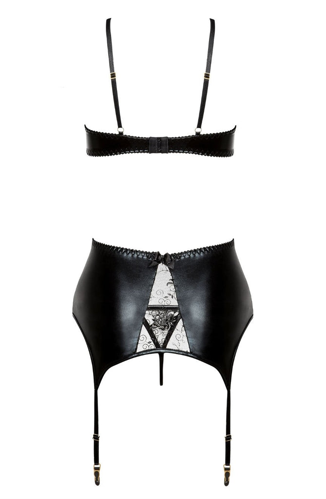 Discover an extremely sexy and at the same time sensual look with the Beauty Night Narine Set. This provocative three-piece ensemble is made from a combination of flexible lacquered soft material and beautiful lace, creating a daring and elegant silhouette. The set consists of an alluring open bra, a deep garter belt, and a matching thong.