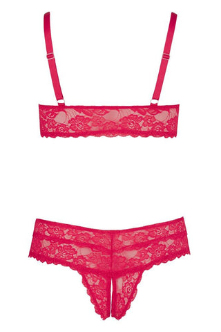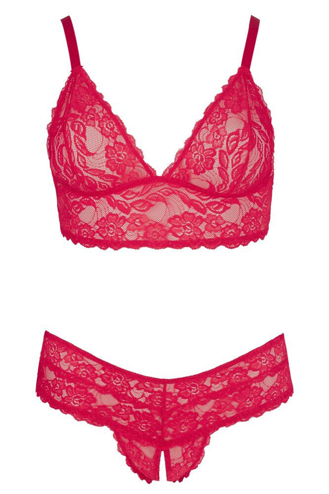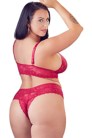 Intense Seduction and Comfort This two-piece Cottelli Curves set is designed for moments of intense passion. Made entirely from delicate red lace, the set includes a wireless bra and matching crotchless briefs, combining a striking aesthetic with a comfortable fit. The red colour adds a touch of boldness and romance.