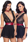 Discover the perfect blend of delicate and daring with the Cottelli Bondage Babydoll. This captivating piece is a stunning fusion of black lace and powernet, beautifully accented by a contrasting red matte-look insert that highlights the waist. The babydoll offers a powerful look with a playfully flared, double-layered skirt that creates an alluring silhouette.
