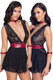 Every detail of this set is designed for versatility and confidence. The babydoll features a low-cut neckline at both the front and back for a seductive look. It includes a stylish belt and a matching collar, both crafted from the same striking red matte material. For a full bondage-inspired look, two restraints with snap hook chains are attached to the belt. Both the belt and the collar with its chain can be adjusted and removed completely, allowing you to customize your style. The restraints feature hook-and-loop fasteners for an easy, secure fit that you can put on or take off in a moment.