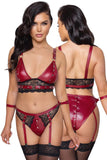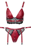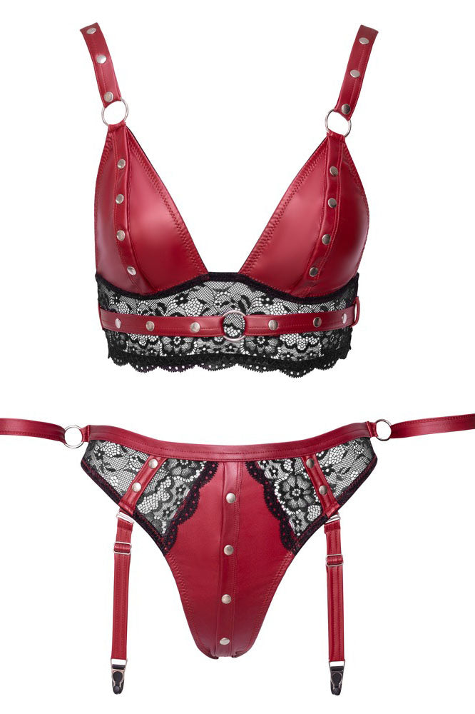 Unleash a world of power and passion with the Cottelli Bondage Red Set, a captivating two-piece ensemble designed to command attention. This set is a striking fusion of bold red matte-look material and delicate black lace inserts, all accented with sleek silver metal details.