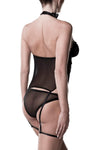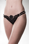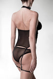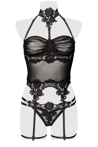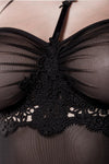 This erotic set features a mesmerizing top crafted from transparent, elastic mesh adorned with delicate crochet lace and a floral pattern. The underwired cups provide support and enhance your natural curves, while the adjustable straps ensure a perfect fit. The matching panties complete the look with a touch of sophistication.