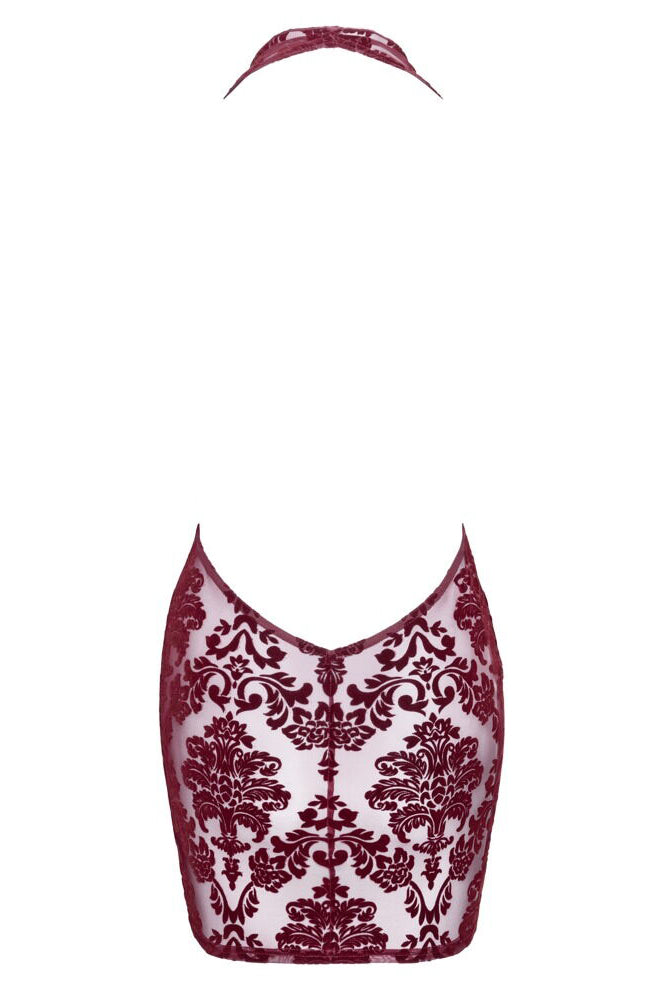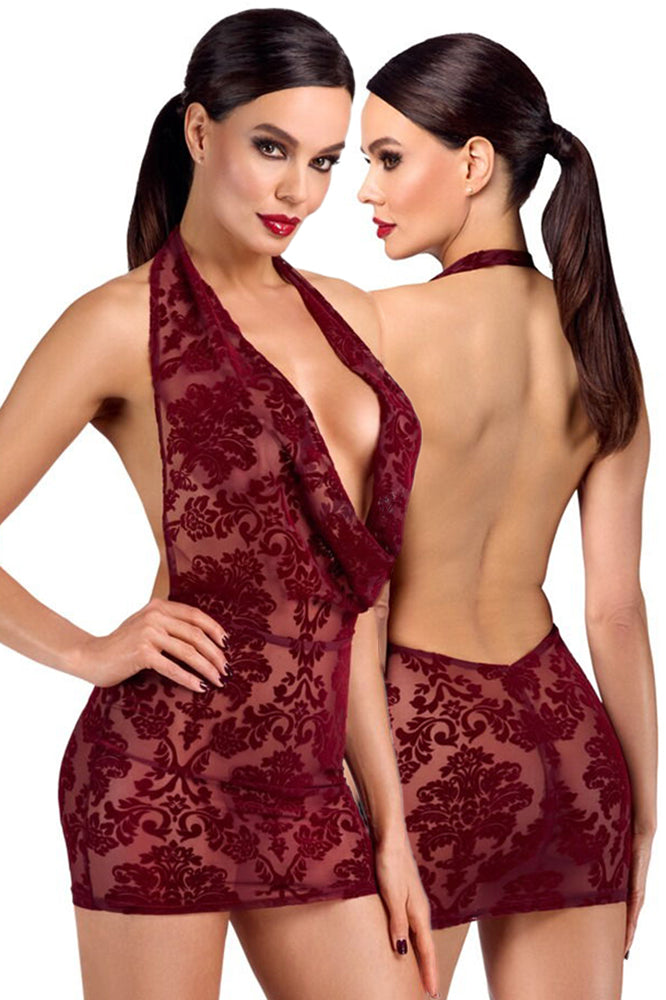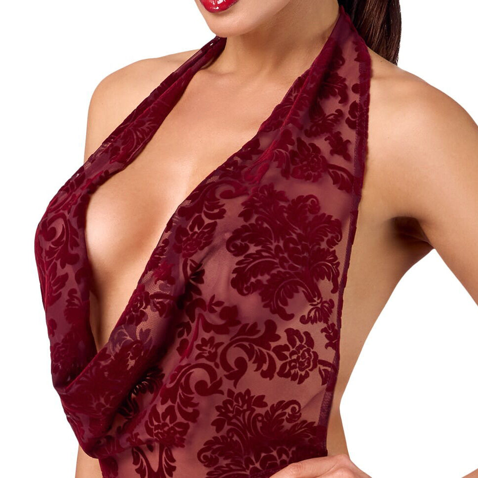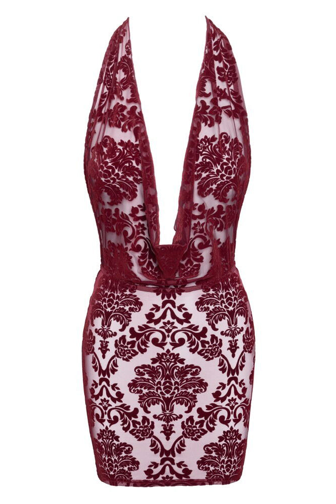 Transparent and velvety for sensual divas! The flattering mini dress Kink Royal from Noir is in a stunning transparent burgundy red colour and is decorated with velvet flock print. It is soft and stretchy for a very comfortable fit and freedom of movement. It also has a very low-cut cowl neckline. It has a halterneck as well – the shoulders and back remain excitingly bare.