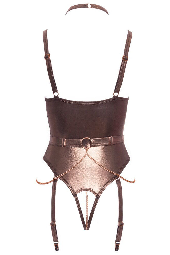 Glamour with a wow factor! The luxurious suspender body from Abierta Fina is in a stylish, shimmering bronze-gold colour. It is also crotchless. It is soft and stretchy for a very comfortable fit. It has elegant rose gold-coloured accessories and decorative chains. This body is in a breathtaking and revealing look with slightly padded underwired shelf bra cups. There is a (removable) stimulating chain over the crotch. The suspender straps can be removed too. The included bronze-gold choker and belt add the finishing touches to this glamorous look. The delicate snap hook chains on the choker can be attached to the rings on the bra straps. The choker, bra straps, belt and suspender straps can be adjusted to fit.