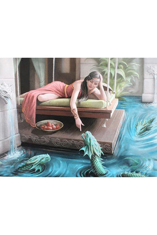 The renowned fantasy artist Anne Stokes brings her talent to life in this captivating canvas picture. Measuring 19cm wide x 25cm high x 1.5cm deep, it depicts a captivating scene unlike any other. The intricate details, from the shimmering scales of the aquatic dragons to the regal beauty of the young woman, create a sense of wonder and timeless elegance.