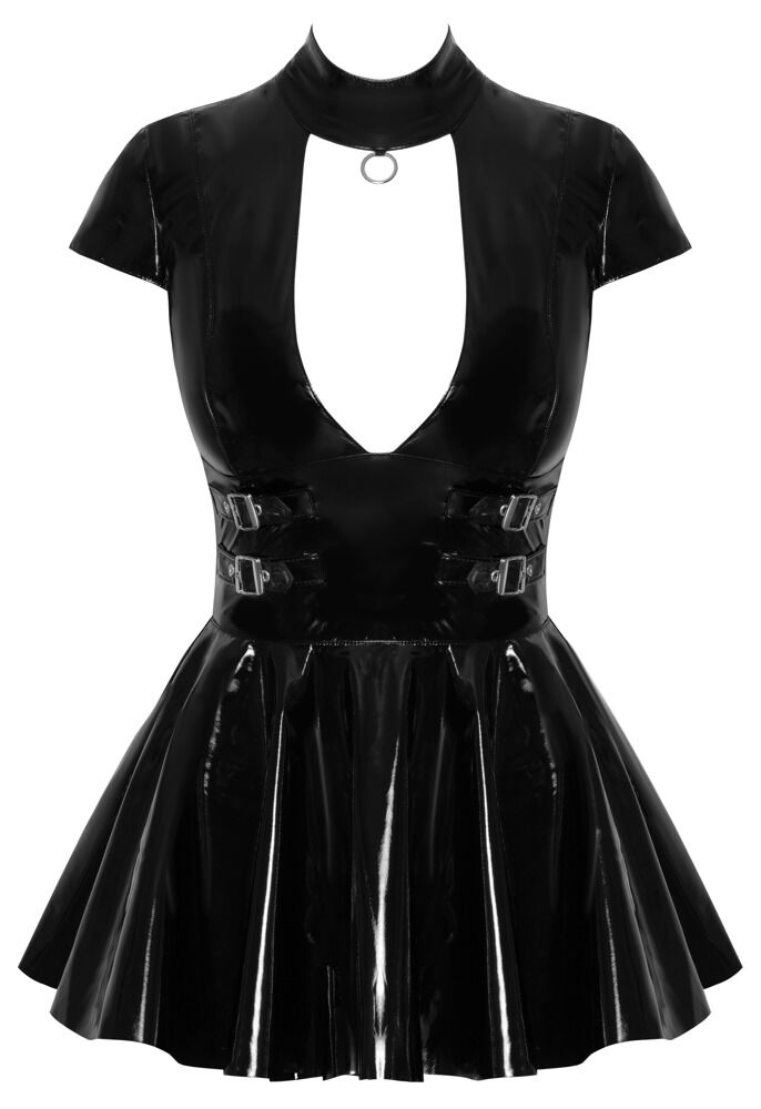 Premium Patent Shine: The dress is constructed entirely from shiny, slick black vinyl (100% polyester with a polyurethane coating), offering a glossy, mirror-like finish that catches the light and demands attention.