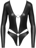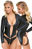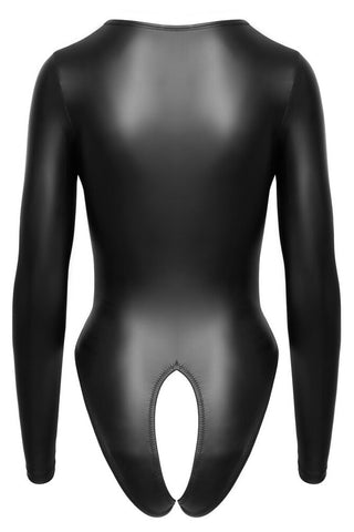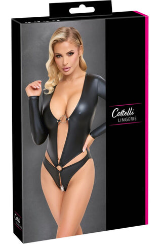 Elegant and provocative with its material and style! The black, crotchless body from Cottelli LINGERIE has long sleeves and is made out of trendy matte look material. It is in a revealing style because it is completely open at the front with just two rings holding it together. There are fancy ruffles with the ring over the stomach. It is completely crotchless as well. The smooth, stretchy, trendy material clings gently to the skin so it fits perfectly. It is also extremely comfortable to wear as well – whatever position a person is in.