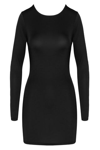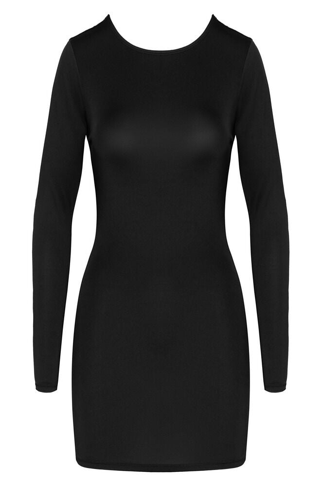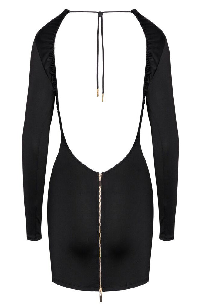 Design: Long-sleeved mini dress with a classic front and dramatic open back.