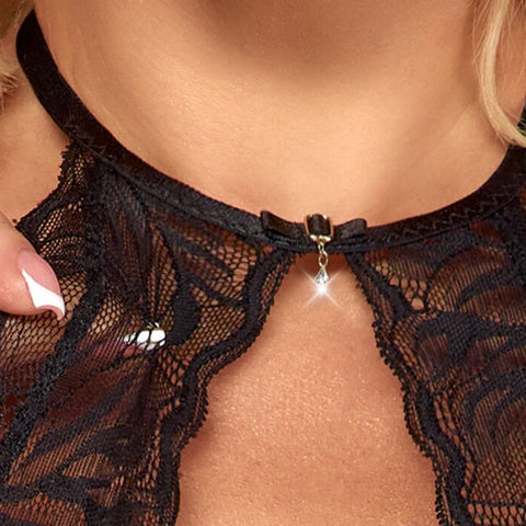 This is a show-stopping body suit that expertly balances bold cut-outs with the sophistication of fine lace. Its soft, stretchy fabric and attention to detail—like the custom glitter stones—demonstrate a commitment to a comfortable, high-quality, and exclusive lingerie experience.