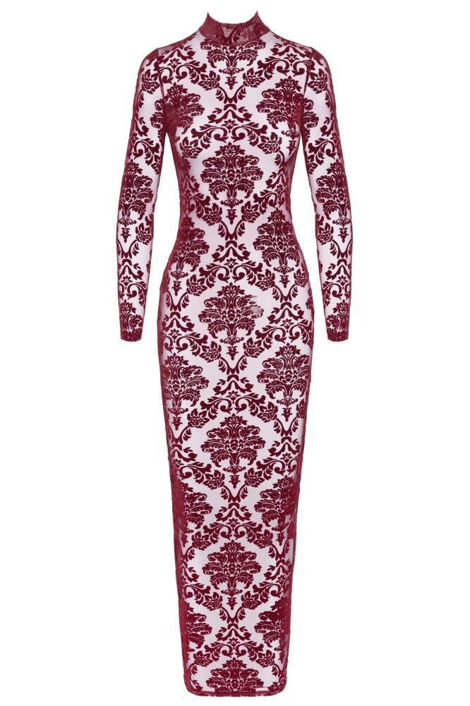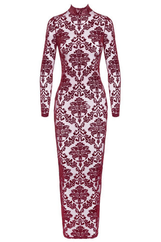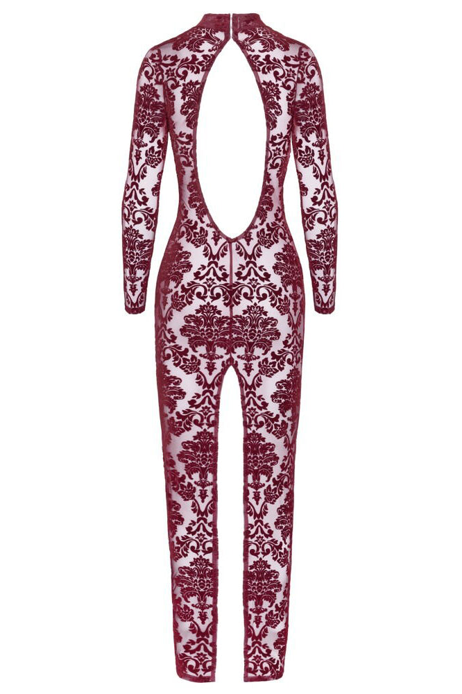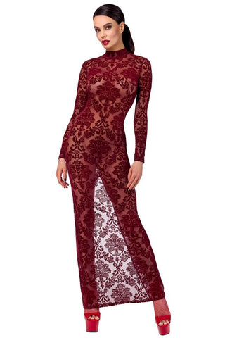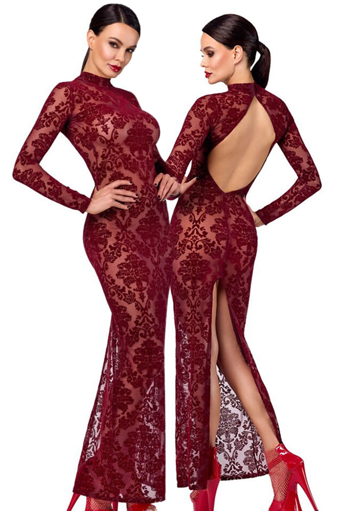Transparent and velvety for sensual divas! The long-sleeved, tapered dress Kink Royal from Noir is ankle-length and in a breathtaking burgundy red colour. It is also decorated with velvet flock print as well. It is soft and stretchy for a very comfortable fit and freedom of movement. There is a large cut-out at the back. It also has an elegant stand-up collar with a hook fastener at the back. The very high slit at the back of this skin-tight dress ensures optimum freedom of movement and adds the finishing touch to this seductive look.