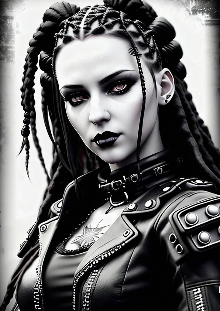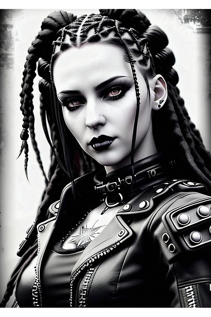 The subject's hair is a complex and striking feature, styled into a mixture of intricate braids and thick, hanging dreadlocks. Her eyes, with a subtle reddish hue, are framed by dramatic black eyeliner and shadow, while her lips are a bold, glossy black. Dressed in a textured black leather jacket with metallic zippers and a thick, buckled choker, she embodies a tough and edgy appearance.