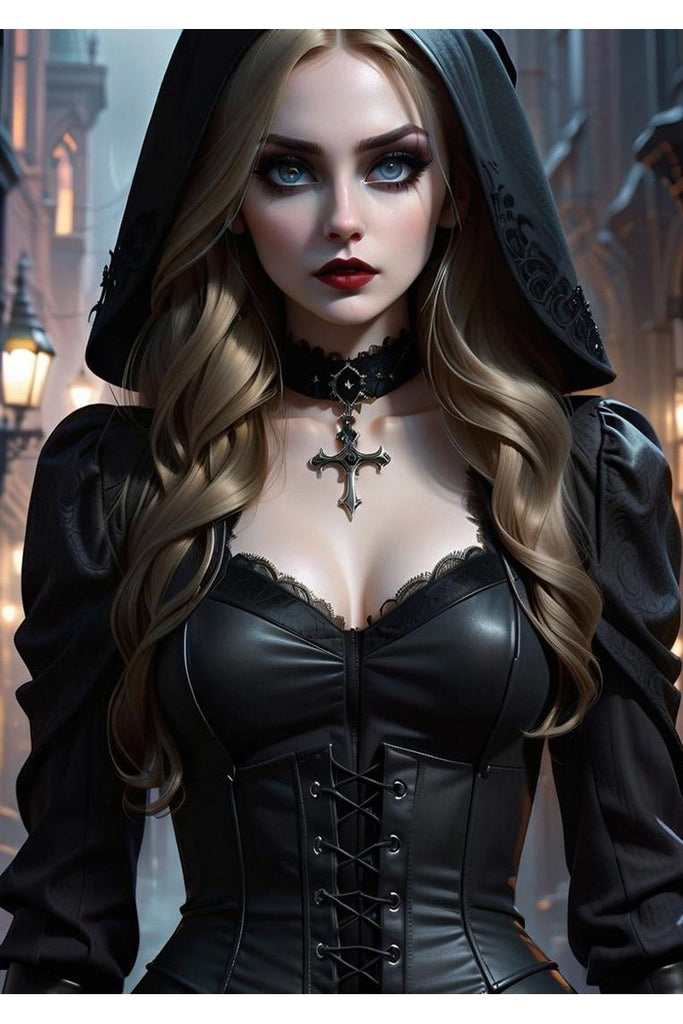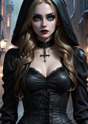 She is dressed in an intricate, all-black gothic-style outfit, featuring a meticulously detailed leather corset with a lace-up front, a delicate lace-trimmed top, and a high-collared choker adorned with a bold cross pendant. The addition of a hood frames her face and adds to her enigmatic aura. The background, a dark cobbled street illuminated by the warm glow of old-fashioned streetlamps, places her in a setting that evokes a sense of Victorian history and drama.