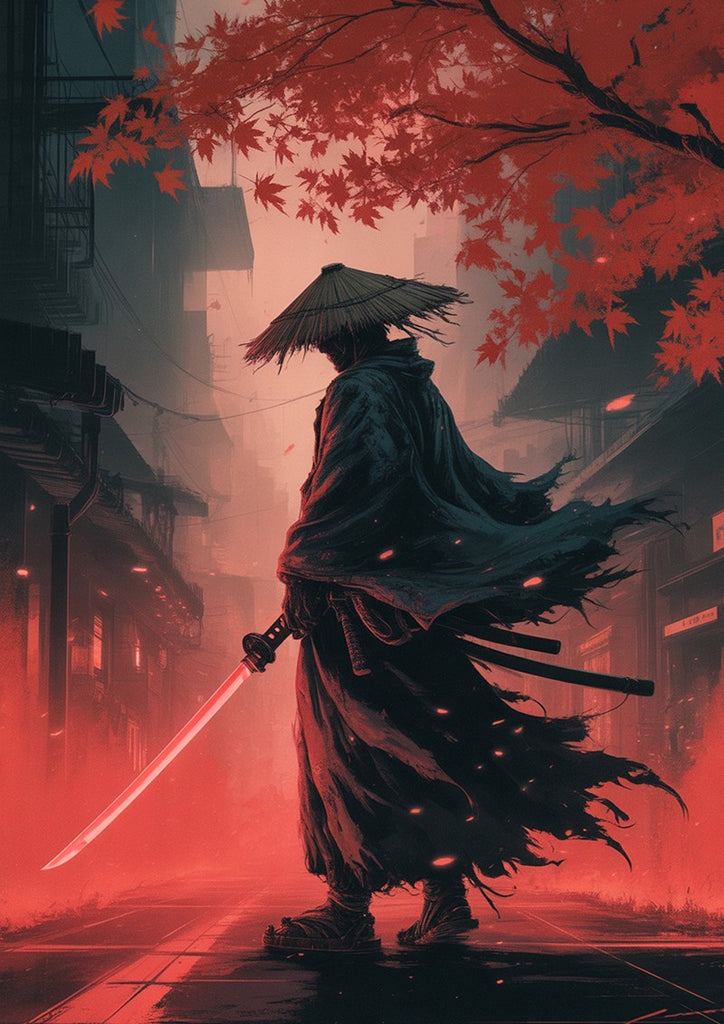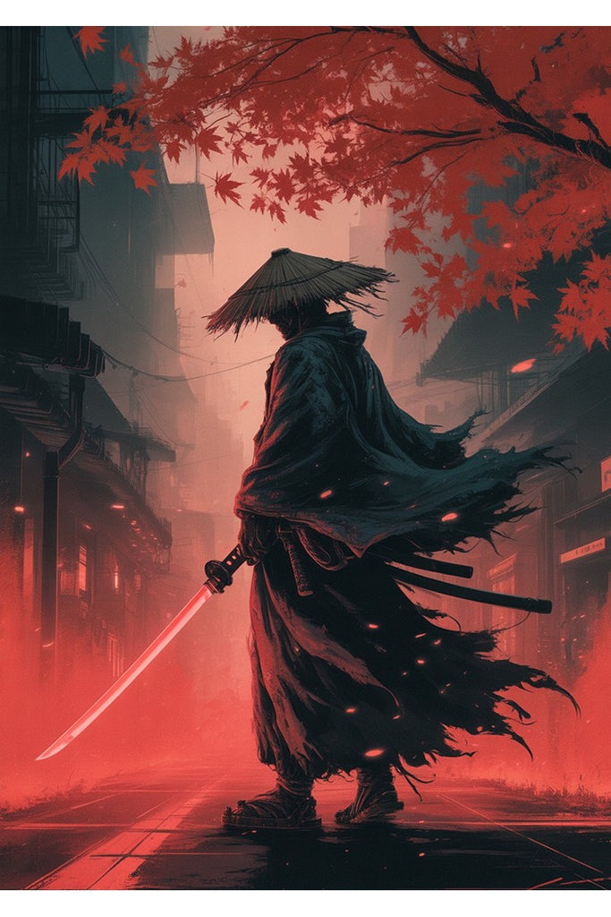 A World of Contrast: The color palette is a study in dramatic contrast, dominated by deep blacks and an aggressive, overwhelming crimson red. This is beautifully framed by an overhead branch of blood-red maple leaves (momiji), blending the beauty of traditional Japanese autumn with a gritty, urban atmosphere. The blurred, shadowed buildings enhance the warrior’s isolation, making the mood intense, solitary, and profoundly dramatic.