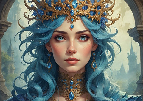 Introduce the mystical elegance of the Queen of the Azure Kingdom framed print from Oakhart Industries. This exceptionally vivid and captivating close-up portrait is a masterpiece of high fantasy, defined by its striking colours and lavish detail. It's the perfect centerpiece for spaces that crave colour, drama, and luxury.