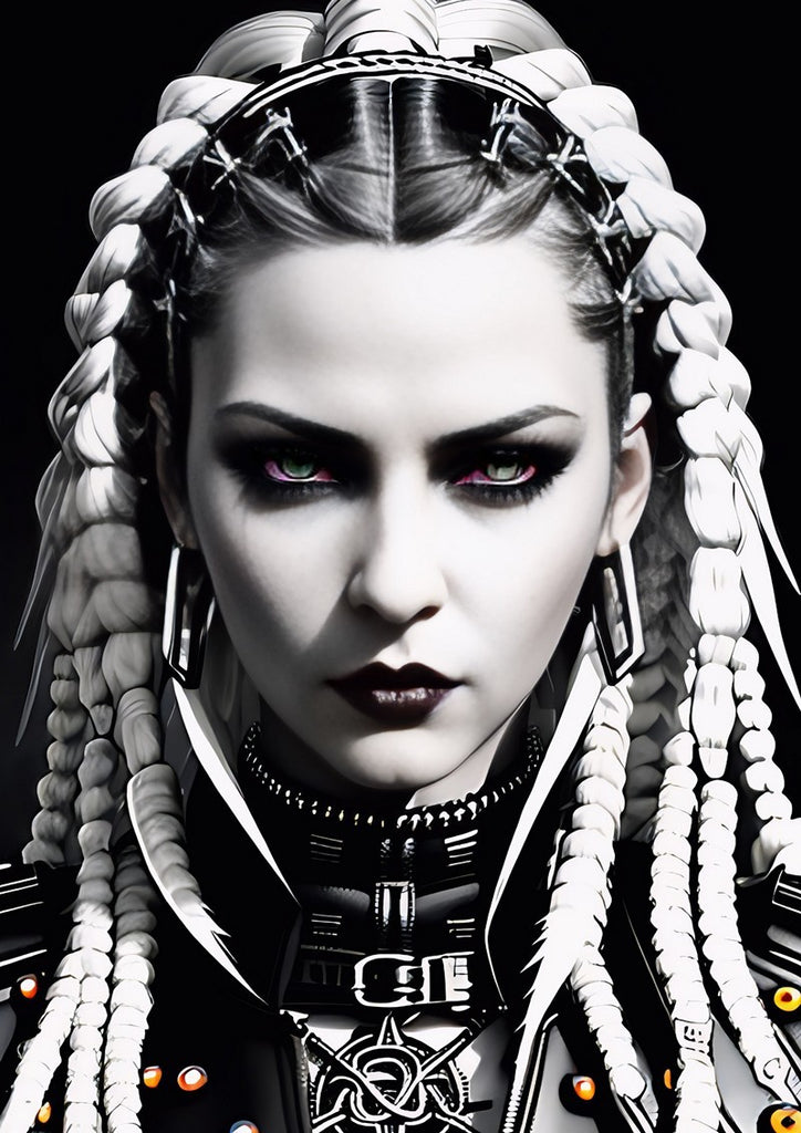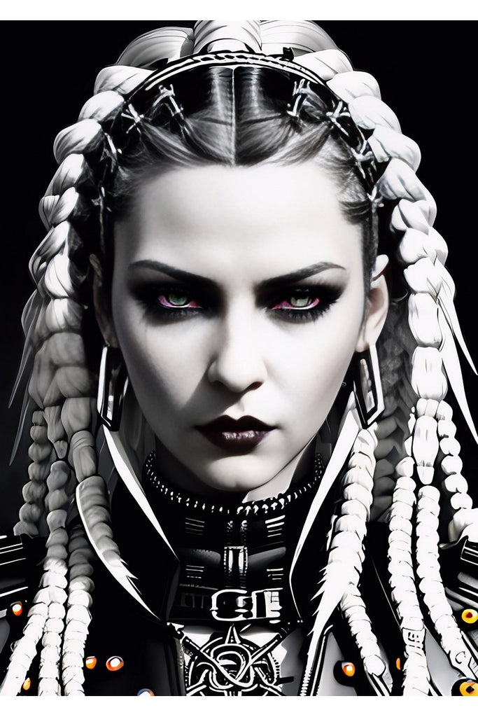The subject's serious, direct gaze is a central feature, with her eyes rendered in a captivating mix of deep green and bold red, framed by sharp black eyeliner. Her lips are a dark, glossy black or deep purple, adding to her commanding aura. Her hair is a dramatic centerpiece, styled into a crown of thick white braids held by a silver, metallic headpiece. Long, braided ponytails adorned with dark metal bands hang down her shoulders.
