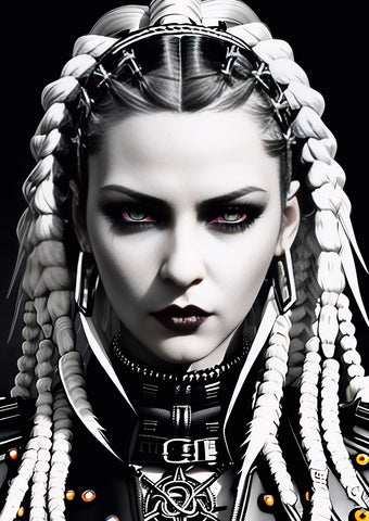 Rule your space with the bold and powerful presence of the Cyberpunk Queen framed print. This highly stylized, futuristic portrait captures a woman with a striking, imposing gaze and an intricate aesthetic that demands attention.