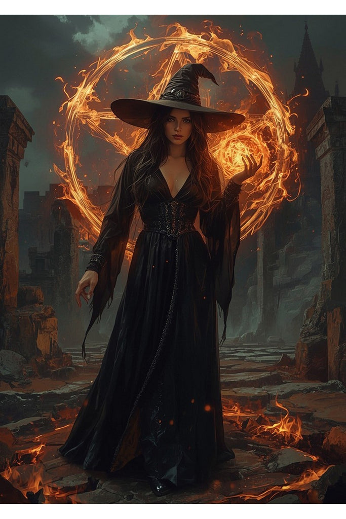 This striking image captures a powerful moment of magic. A sorceress, dressed in a flowing black gown and a classic pointed hat, stands in the center of an ancient, ruined landscape. She holds a glowing orb of fire in her hand, while a massive, blazing pentagram radiates intense light behind her. Flames lick the ground around her feet, and the stormy sky adds to the dramatic, mystical atmosphere. Her confident gaze and the intricate details of her outfit—from the laced corset to the sheer, bell-like sleeves—create a captivating and commanding presence. This portrait is a testament to fantasy and power, perfect for anyone who loves high-drama, magical art.