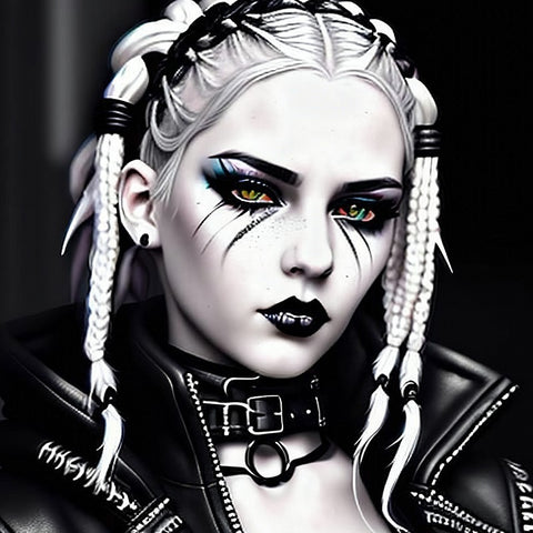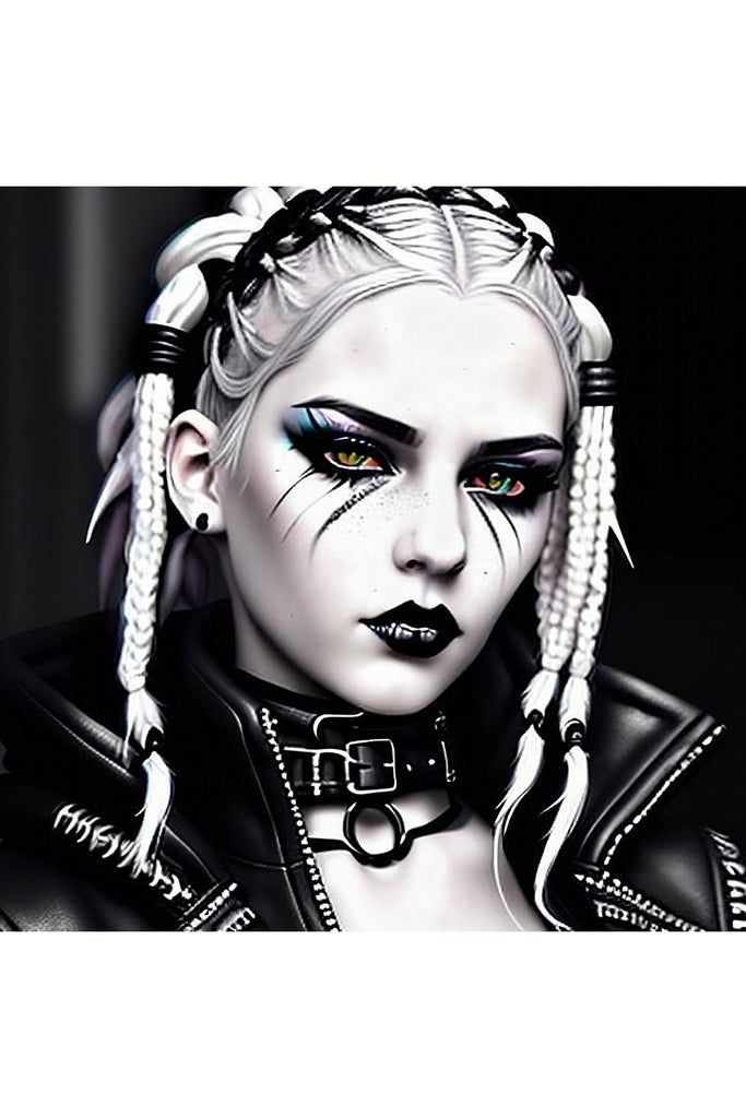 Dressed in a black leather jacket with prominent zippers and lacing details, the subject wears a thick choker with a large silver buckle, exuding an air of quiet rebellion. The solid black background makes their stark color scheme pop, creating a truly unforgettable piece of art.
