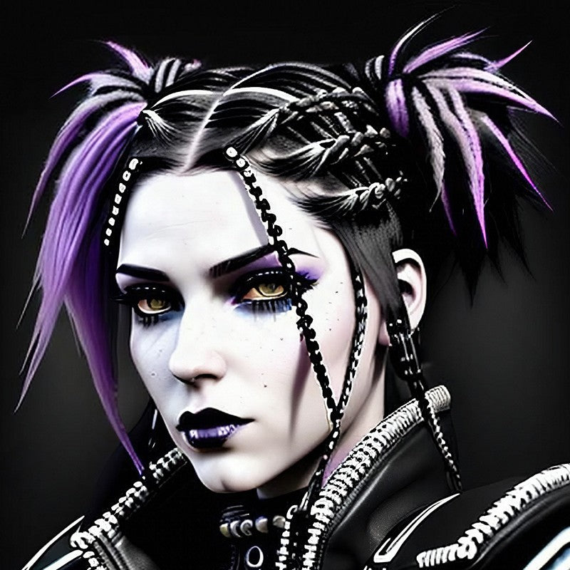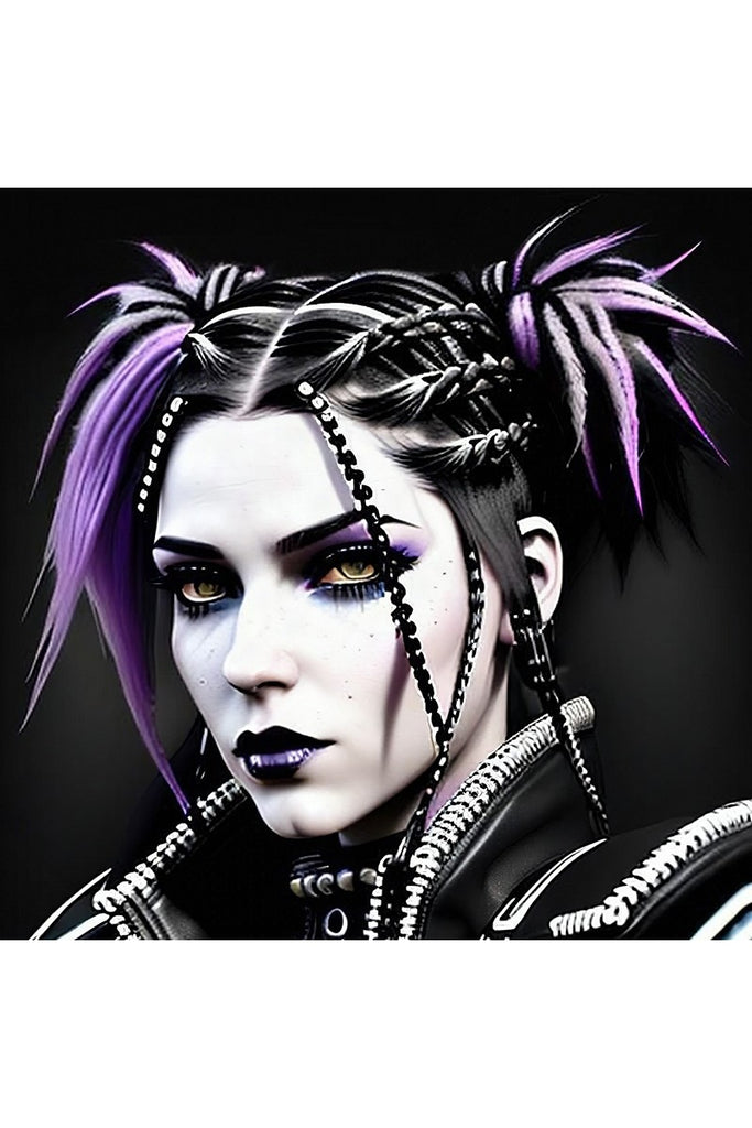 Key features include very pale skin and a captivating expression, brought to life by a high-contrast style. Their eyes, a captivating yellow-gold color, are framed by dramatic makeup with purple eyeshadow and long, painted lashes. The subject's hair is a mix of black and vivid purple, styled into two high, spiky ponytails with intricate braids and small beads. They are dressed in a black leather jacket with prominent silver zippers, completing this edgy and modern look.