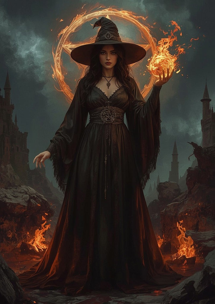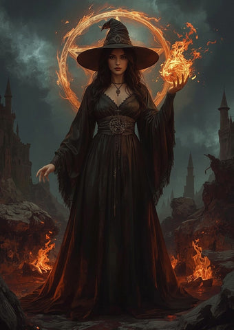In her hand, a glowing orb of fire radiates with intense light, its energy echoing the massive, fiery pentagram blazing behind her. The desolate, rocky landscape, with its crumbling spires and flickering flames, adds to the ominous and captivating atmosphere. This artwork is a testament to the raw beauty of fantasy, perfect for adding a touch of dark magic and high-drama to any space.