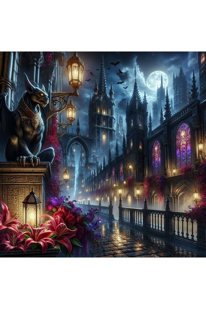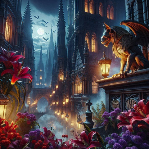 In the foreground, a menacing yet majestic gargoyle with glowing eyes stands vigilant on a stone railing, acting as a silent guardian over the street below. This powerful figure is framed by a rich array of vibrant flowers, including striking red lilies and clusters of purple blossoms, which provide a beautiful and dramatic contrast to the dark stone architecture and moody atmosphere. The detail of bats flying in the distance adds to the mysterious and fantastical vibe of the artwork.