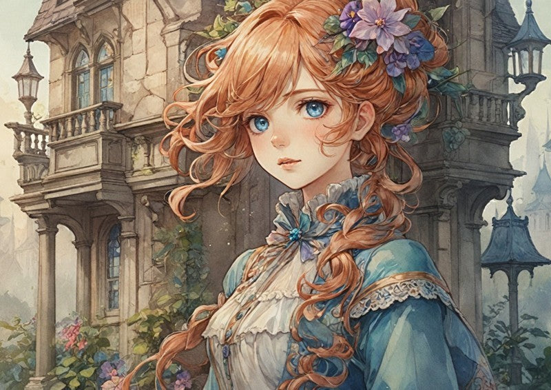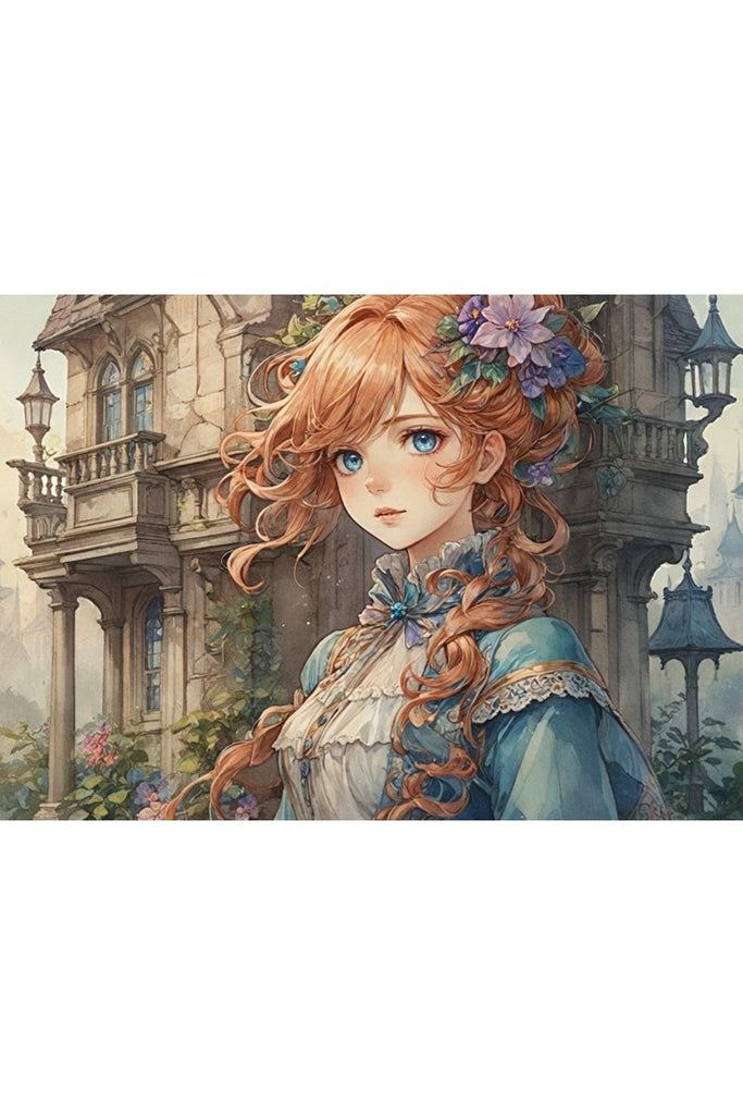 She is elegantly dressed in a light blue and white Victorian-style gown, intricately detailed with lacework and ribbons. The setting is a lush garden with climbing vines and an elegant, old stone building, all rendered with a soft, watercolor texture that gives the piece a dreamy, romantic feel. This print beautifully blends classic elegance with a fantasy-inspired aesthetic, making it a perfect addition for anyone who appreciates art that tells a story.
