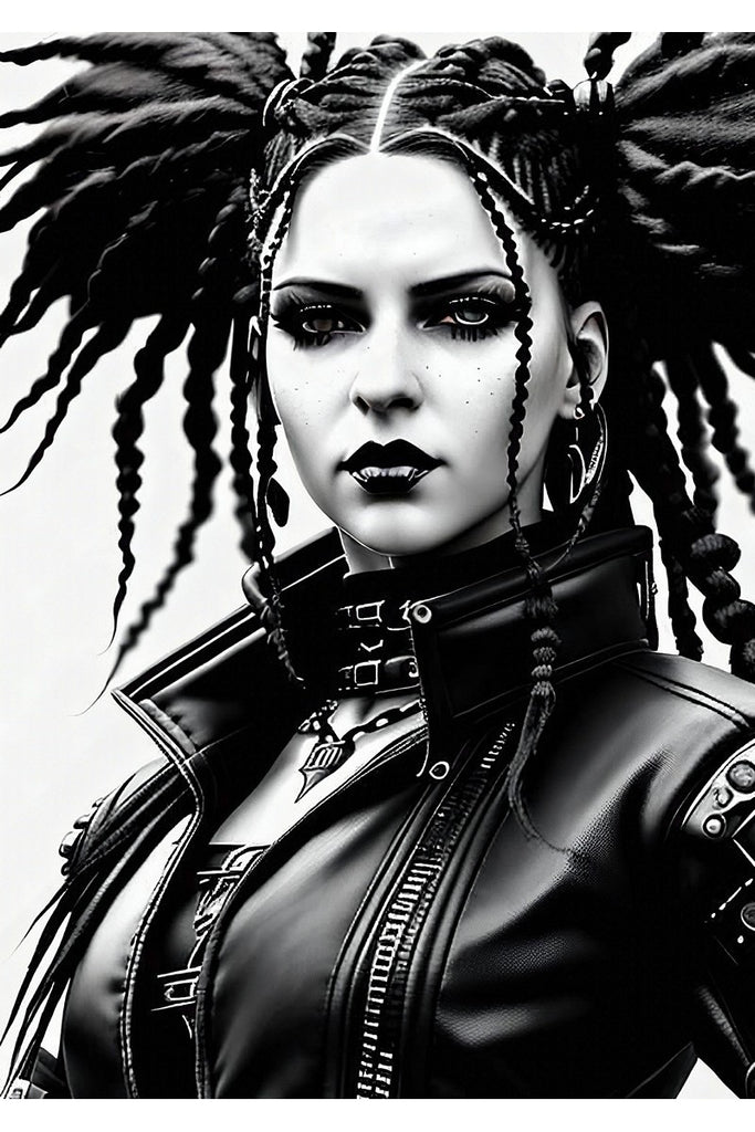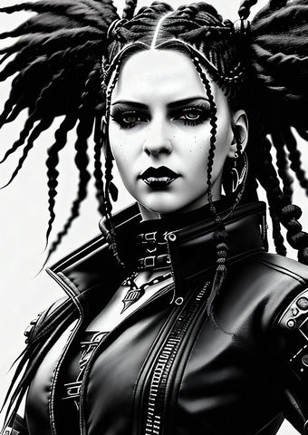 Dressed in a textured black leather jacket with prominent metallic zippers and a thick choker, the subject exudes a tough and resilient aura. The stark white background makes her dark clothing and strong features pop, creating a truly unforgettable piece of art.
